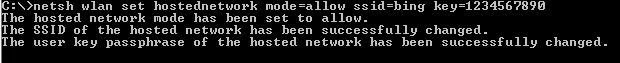 netsh wlan set hostednetwork mode=allow ssid=bing key=1234567890